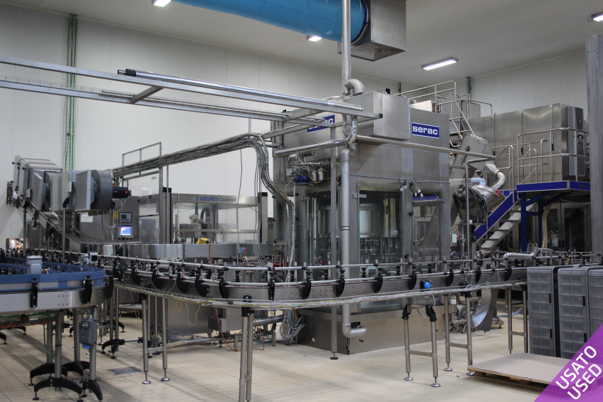 Gebrauchte Anlage zur Abfüllung von PET-Flaschen, derzeit im Einsatz für die Abfüllung von Frischmilch in 1-Liter-Flaschen, mit einer Produktionsleistung von ca. 8.000 Flaschen/Stunde. Die Anlage eignet sich außerdem zur Abfüllung von Säften und nicht kohlensäurehaltigen Getränken, ausschließlich in PET-Flaschen mit einem Halsdurchmesser von 38 mm.