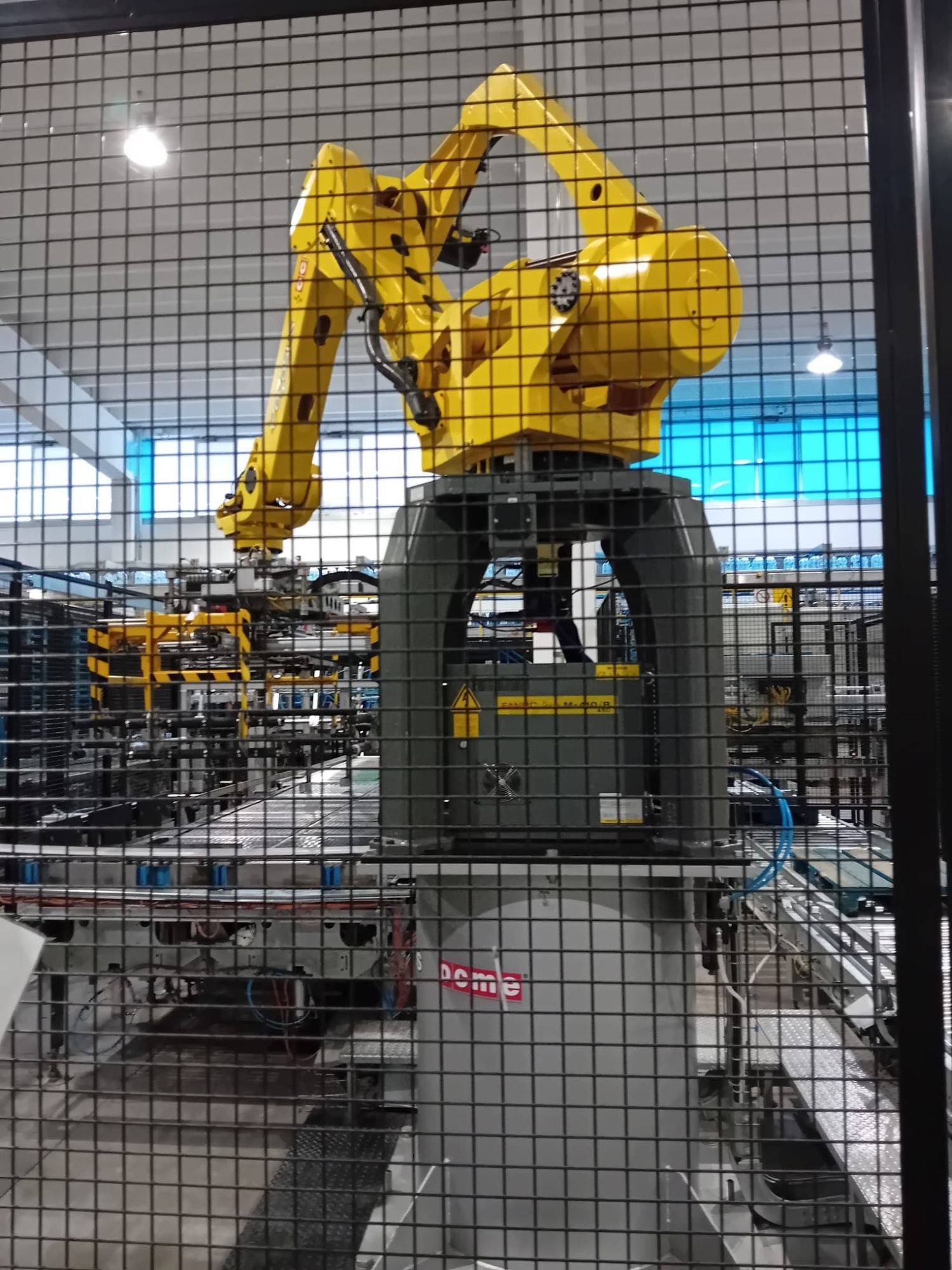 La linea include sistemi di movimentazione a nastro, moduli di riempimento e tappatura, unità di etichettatura, sistemi di ispezione e soluzioni automatizzate per la gestione del fine linea. La presenza di robot industriali consente una movimentazione precisa e ripetibile dei carichi, migliorando la produttività complessiva.