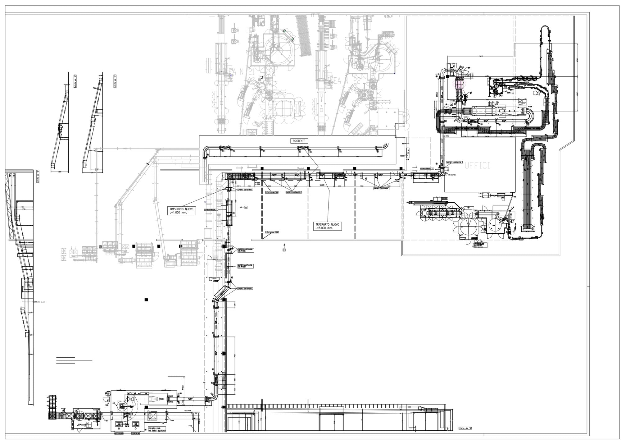 L’impianto è composto da diverse sezioni integrate che coprono l’intero processo: dal trasporto contenitori fino alla fine linea con pallettizzazione. La configurazione è adatta a contesti produttivi strutturati, dove è richiesta una gestione efficiente dei flussi e una riduzione delle operazioni manuali.