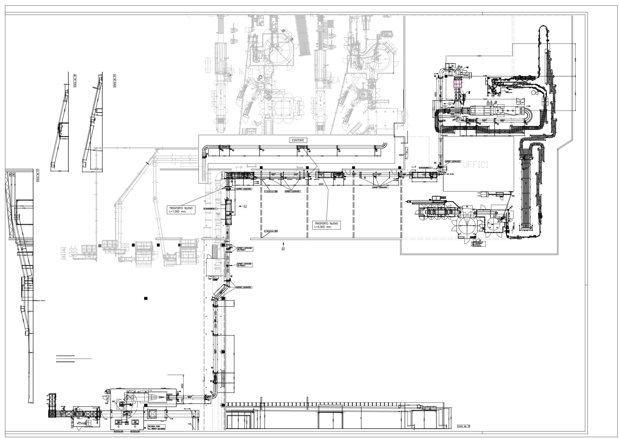L’impianto è composto da diverse sezioni integrate che coprono l’intero processo: dal trasporto contenitori fino alla fine linea con pallettizzazione. La configurazione è adatta a contesti produttivi strutturati, dove è richiesta una gestione efficiente dei flussi e una riduzione delle operazioni manuali.