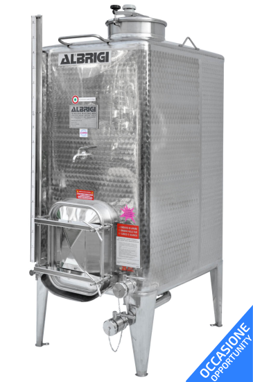 Piedi fissi h. 500 mm, n. 2 valvole DN 50, asta livello aperta, portella rettangolare verticale 530x405 mm, gancio di sollevamento, preleva campioni, poggiascala, targa identificazione inox.